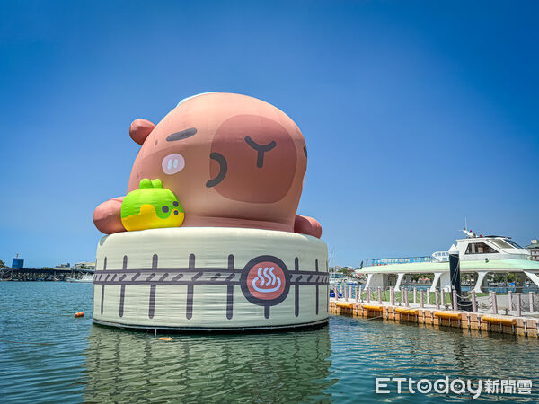 每年初秋,安平漁人碼頭周邊都會舉辦大型IP展覽,今年首次與台灣原創IP「卡比胖拉」合作,主視覺包括在水上放置1組高達12公尺的超萌泡湯水豚,以及2組高達5公尺陸上中型氣偶,包括捧著一碗寫著「TAINAN」擔仔麵的坐姿水豚,以及可愛的趴姿水豚。